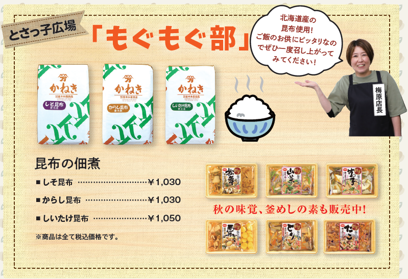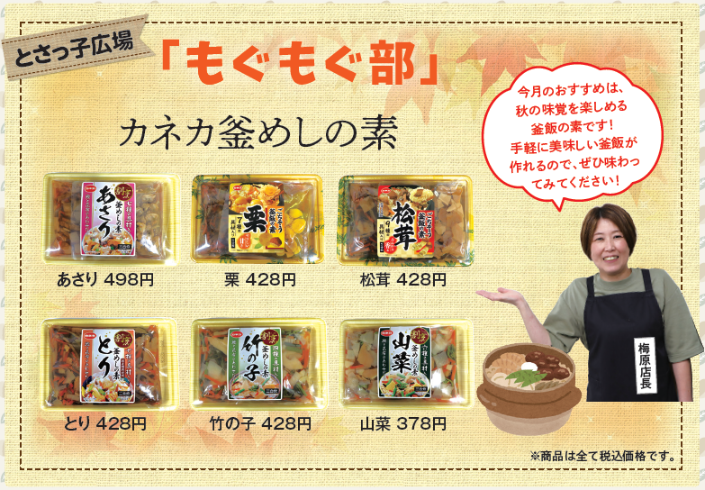 今月のおすすめは、秋の味覚を楽しめる釜飯の素です!手軽に美味しい釜飯が作れるので、ぜひ味わってみてください!