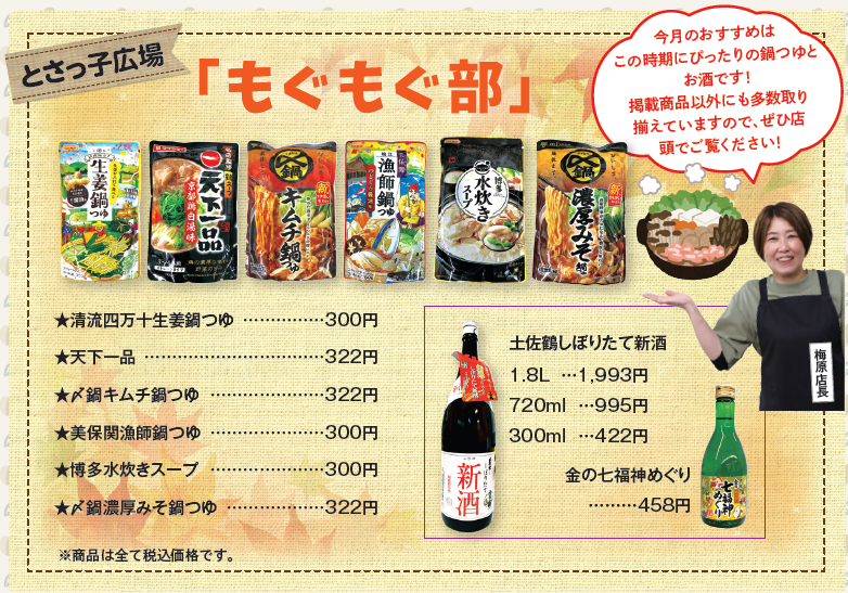 今月のおすすめはこの時期にぴったりの鍋つゆとお酒です!掲載商品以外にも多数取り揃えていますので、ぜひ店頭でご覧ください!