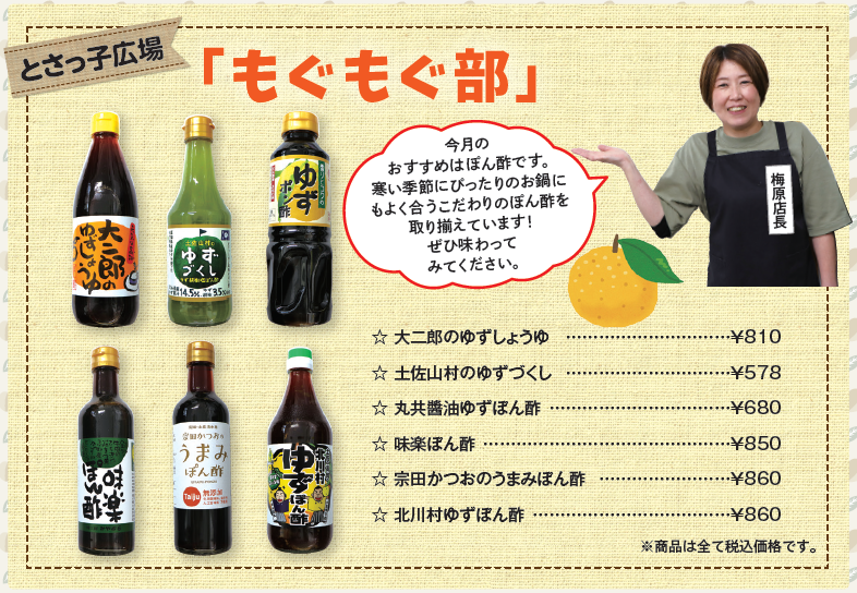 今月のおすすめはぽん酢です。寒い季節にぴったりのお鍋にもよく合うこだわりのぽん酢を取り揃えています!ぜひ味わってみてください。