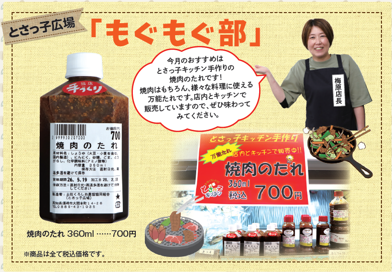 今月のおすすめはとさっ子キッチン手作りの焼肉のたれです!焼肉はもちろん、様々な料理に使える万能たれです。店内とキッチンで販売していますので、ぜひ味わってみてください。